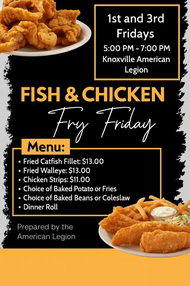 Join your family and friends at the Knoxville Legion for an amazing fish or chicken dinner. Fried catfish dinner $13.00 Fried Walleye dinner $13.00 Chicken Strip dinner $11.00 Choice of Baked Potato or Fries Choice of Baked