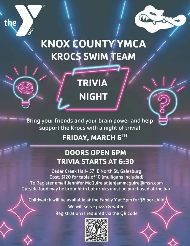 The YMCA Knox County Swim team will be having a Trivia Night at Cedar Creek Hall on Friday, March 6th at 6pm Central. Please come out to support this organization.